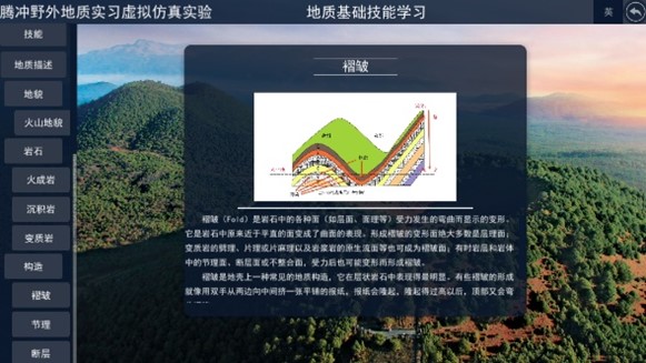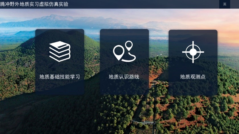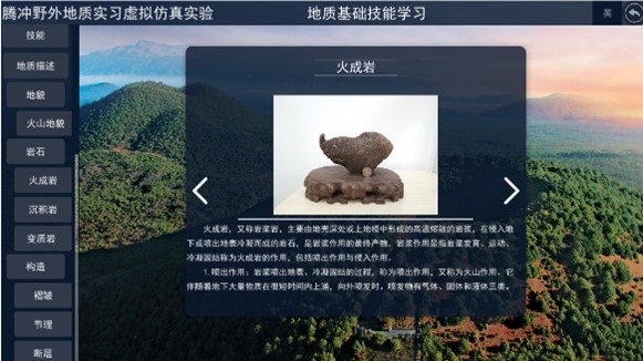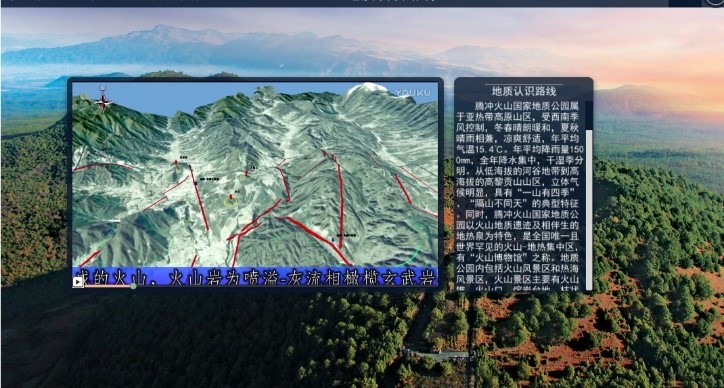 在“地质认识路线”模块,在线漫游浏览体验腾冲地区三维实景,登录云平台。为便于观察,将三维实景视图最大化。浏览腾冲地区的三维飞行视频,了解实习路线地质背景特征。阅读腾冲地区相关地质资料,认识大地构造背景,认识实习区区域地层、岩浆岩、构造、区域矿产情况,进一步认识腾冲地区地质景观特征及观测点分布相关情况。此部分有1个场景和认知互动环节。