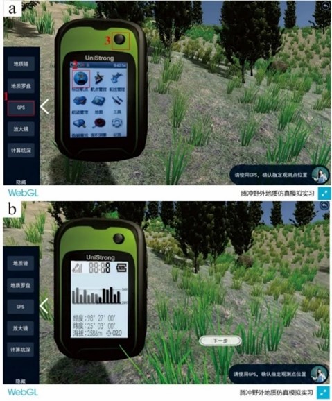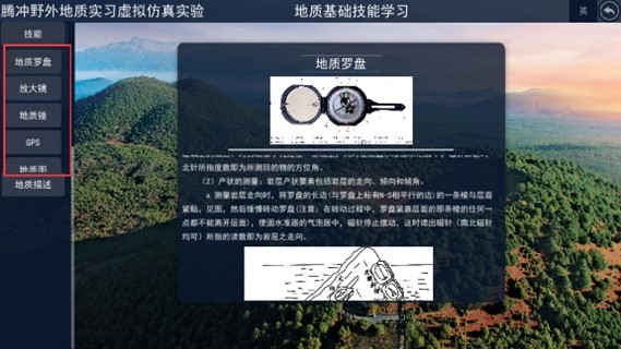 在“地质观测点”模块,互动式三维场景中开展GPS、罗盘操作使用,认识山体定位、坡度及坑深等地貌特征。在三维场景中互动式体验操作GPS、地质锤、放大镜等工具。