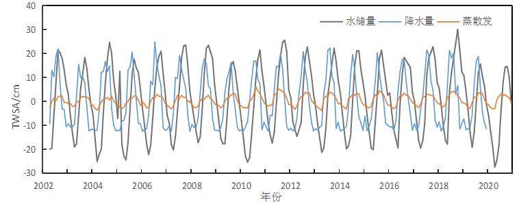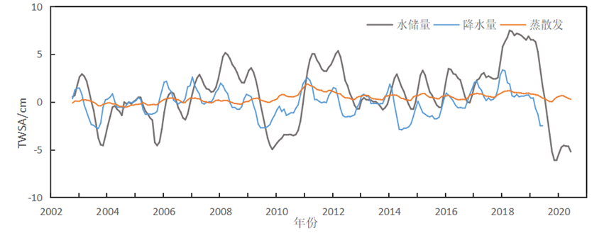 图2 2002—2020年中缅“人字形”经济走廊陆地水储量、降水量、蒸散发量变化