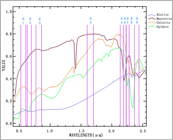 图1 绿泥石、绿帘石、黑云母和白云母标准波谱曲线及其与ASTER数据波段对应图