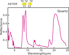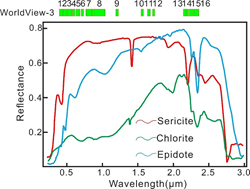 图1 石英、绢云母、绿泥石、绿帘石标准波谱曲线及其与ASTER、WorldView-3数据波段对应图