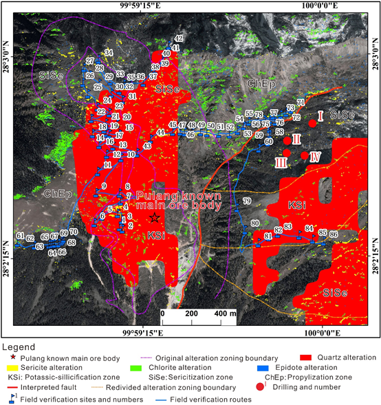 普朗斑岩铜矿床是中国铜资源勘查的主要潜力区之一,具有典型的斑岩蚀变分带特征。然而,蚀变矿物对成矿特征、找矿勘查的指示意义有待进一步研究。鉴于此,本研究利用ASTER和WorldView-3数据,通过比值法、主成分分析和光谱面积法提取了热液蚀变矿物,随后,对蚀变矿物的指示意义进行了深入研究。对普朗斑岩铜矿的成矿构造和蚀变分带空间分布有了新的认识。,并得到了较好的野外验证:①在普朗斑岩型铜矿区东北部存在一条主体呈NE向展布的成矿构造,推测为正断层;②重新划分了普朗斑岩型铜矿区蚀变分带,认为普朗斑岩型铜矿区除位于断层西侧的原蚀变分带中心外,断层东侧还存在一蚀变分带中心,且具有在水平方向从内至外呈钾化硅化、绢英岩化、青磐岩化的蚀变分带特征;③推测普朗斑岩型铜矿区东侧区域重新划分的钾化硅化带及绢英岩化带交界地段存在较大找矿潜力。这项研究表明,光谱/多传感器卫星数据对于世界上地质条件复杂、偏远的斑岩铜矿勘探的初步阶段是经济有效的工具。