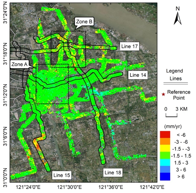 ● 使用PSI技术获取了2013年-2020年上海地铁沿线地表形变速率。